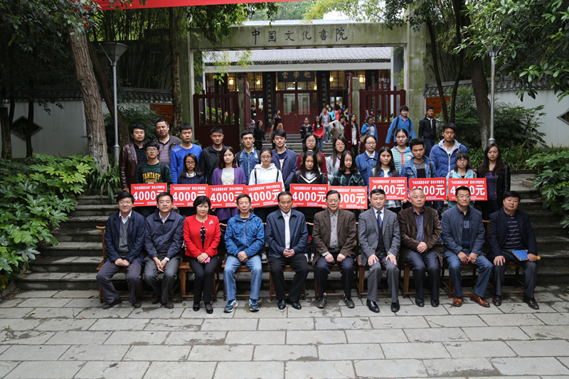 仪式后,到场嘉宾与受助学生在我校文化书院前合影。